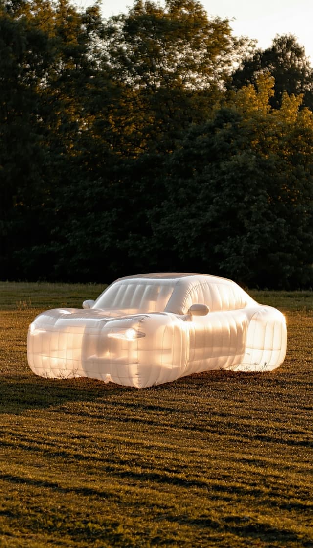 A realistic photo of a full-size transparent inflatable car standing in the middle of a wild grassy field during golden hour, soft warm sunlight, long shadows, gentle breeze moving the grass, surreal and poetic atmosphere, high detail and natural colors.