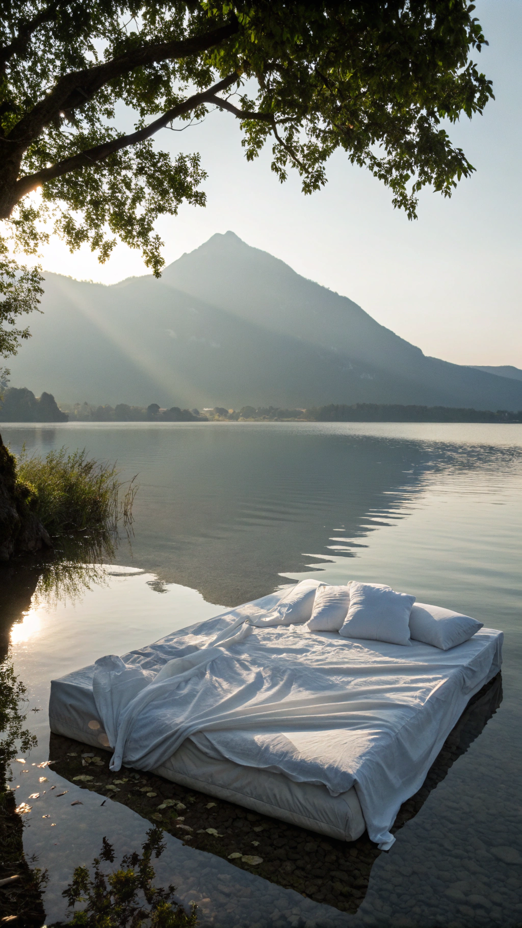 A WHITE LINEN-COVERED BED FLOATING ON A CALM LAKE, WRINKLED SHEETS AND TWO PILLOWS, SHADOW OF A TREE PARTIALLY OVER IT, PEACEFUL MOUNTAIN BACKDROP, AMBIENT SUNLIGHT ON FOLDS OF FABRIC, PHOTOGRAPHED WITH SONY A7R V, CONCEPTUAL EDITORIAL