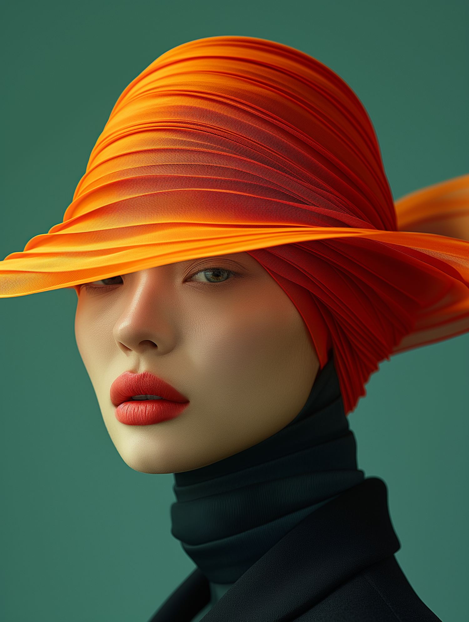 Surreal minimalist portrait of a professional female cyclist with black hair and freckles, she is facing the camera. She wears aerodynamic running sport glasses, their lenses vividly reflecting a mountain landscape. Set beneath a crystal-clear blue sky, the scene is bathed in soft natural lighting. Dominant color palette of rich blue and vibrant orange. Clean composition, high detail, cinematic atmosphere