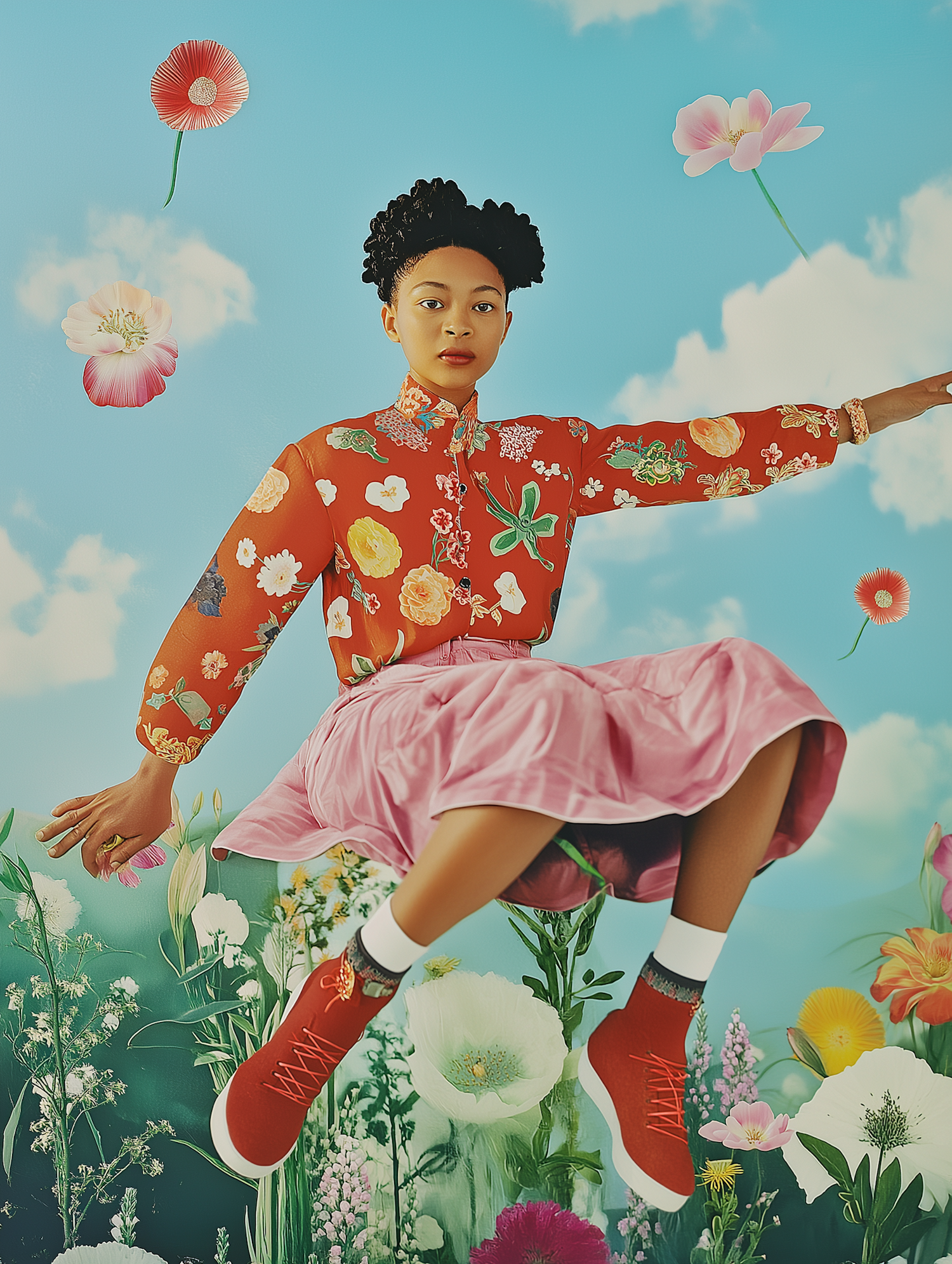 Realistic abstract organic sculpture levitating mid-air - soft green moss, translucent quartz crystals, dew droplets, pastel wildflowers, clean white background, zen balance, minimalistic, soft ambient light, hyper-detailed textures, natural shadows.
