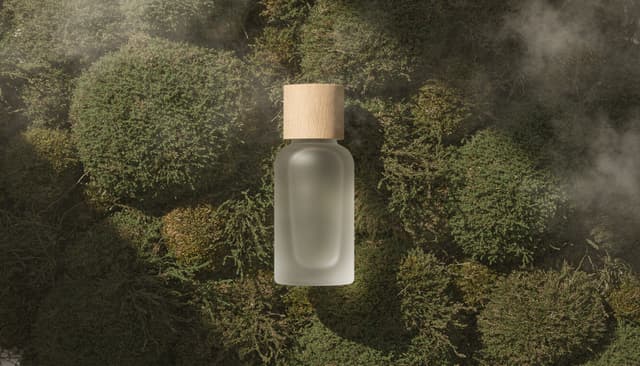 A matte glass skincare bottle with wooden cap placed on a bed of deep green moss. Shot top-down with soft natural light mimicking daylight from a window. The bottle is centered, shadows are diffused, subtle fog effect in the background. Focus on texture: porous moss, smooth frosted glass. Scandinavian eco-luxury product photography aesthetic